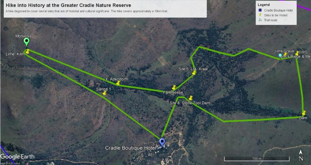 Sites visited include the Umsuka Science Hub, a viewpoint, Motsetse Cave, the lime kiln and the Malapa Museum